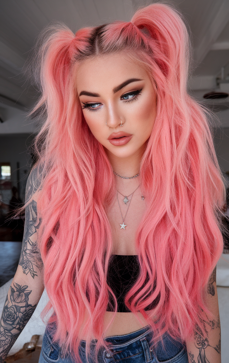Bold and whimsical, this hairstyle combines vivid pink waves with playful double ponytails. The hair is parted down the center, framing the face with soft tendrils that add texture and volume. The candy-colored hue elevates the style, making it fun and edgy while maintaining a chic aesthetic.