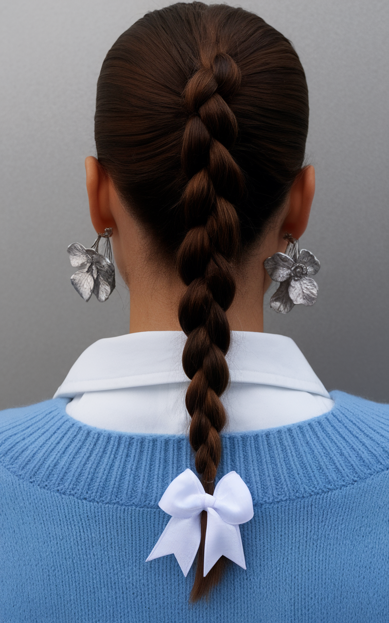 This timeless braid is crafted with rich chocolate brown hair, showcasing a neat and uniform plait running down the back. The braid is tied off with a delicate white ribbon bow, bringing a youthful and feminine touch to the elegant simplicity of the style.