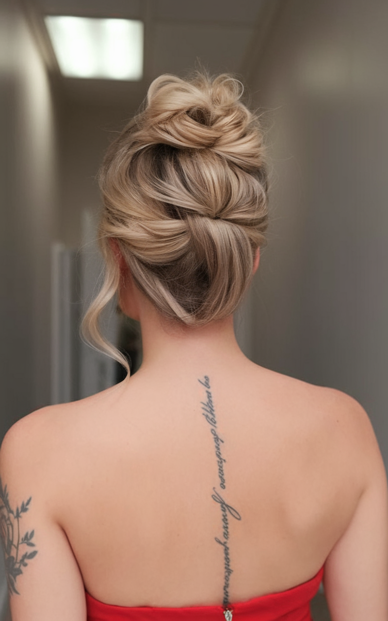 This elegant updo features layers of expertly twisted sections that are pinned together seamlessly, creating a voluminous and intricate design. The soft blonde tones, highlighted with subtle lowlights, enhance the texture and depth of the hairstyle. Loose strands around the face add a delicate, romantic touch.