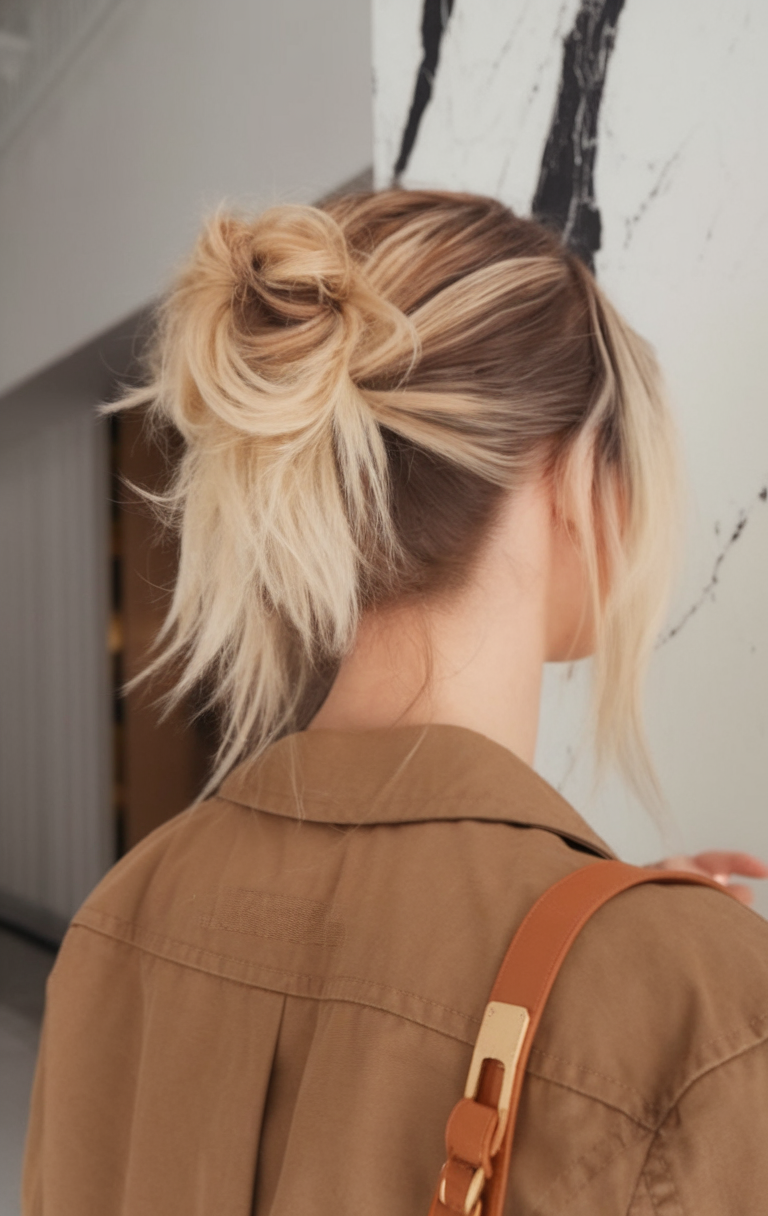 This effortless messy bun is elevated with a blend of honey blonde and platinum streaks, providing dimension to the style. The loose, face-framing strands create a casual yet chic vibe, perfect for everyday wear or a relaxed outing.