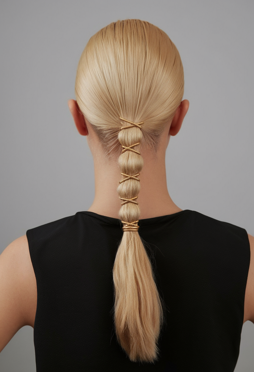 This bubble ponytail is a chic and simple choice for spring, combining elegance and ease. The hair is neatly tied with gold bands at intervals, creating a structured yet playful appearance. Ideal for medium-length hair or long hair, this style works for both thin hair and thick hair, making it perfect for daily or office looks.