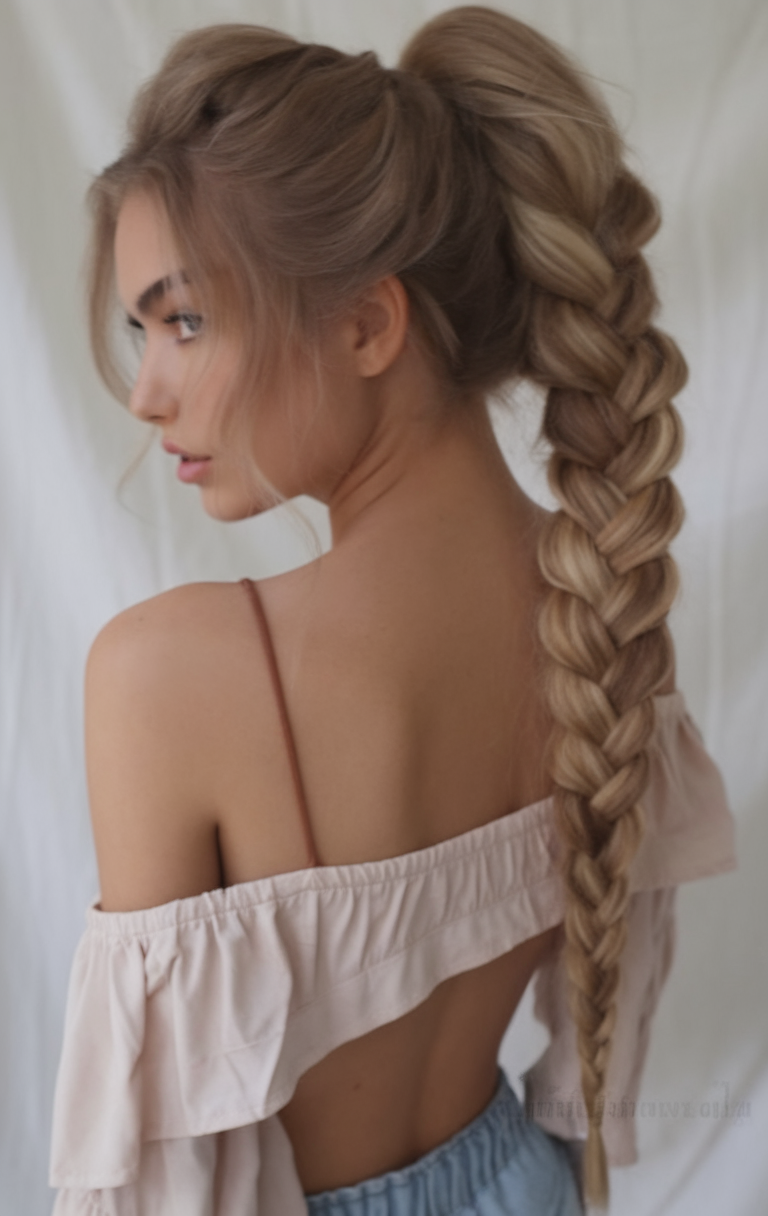 A voluminous braided ponytail designed for long hair, this look adds a dramatic touch to any occasion. The height at the crown and the loose braid give it a soft, romantic vibe, making it perfect for a concert or an everyday spring look. This style is particularly stunning on thick hair, but can be adapted for those with medium hair.