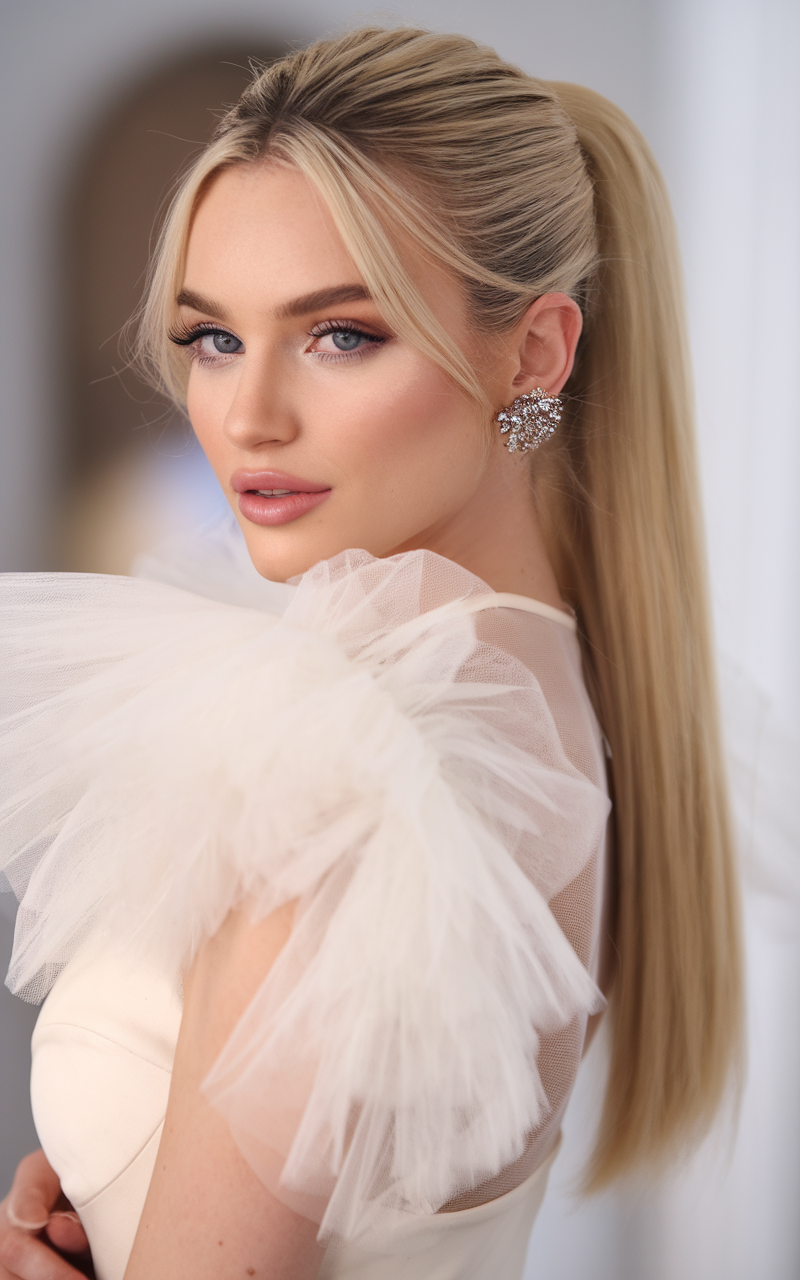 This sleek ponytail features long, straight hair tied high with precision for a polished and refined finish. The clean parting and smooth texture highlight the glossy blonde tones, making it an excellent choice for thin hair. Perfect for school, office, or even daily spring activities, this style is ideal for those with medium-length hair or long hair.