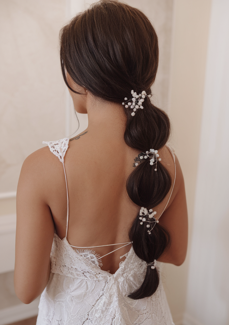 A soft bubble ponytail accented with delicate floral pins for an ethereal finish. The voluminous bubbles add dimension, making this style ideal for medium hair or long hair with thick strands. This look is perfect for a spring event or a daily hairstyle when a touch of elegance is needed. The deep brown hair color enhances the floral embellishments, creating a striking contrast.