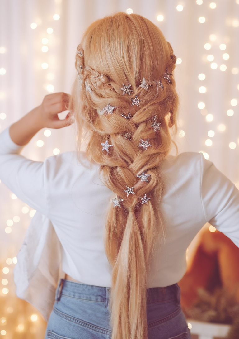 This whimsical braided updo features a cascade of loose, intertwining braids adorned with sparkling star clips. The golden blonde hair color enhances the fairytale-like charm, making it an excellent choice for spring celebrations or concerts. Best suited for long hair or medium-length hair, this hairstyle offers a blend of texture and glam, perfect for thick hair.