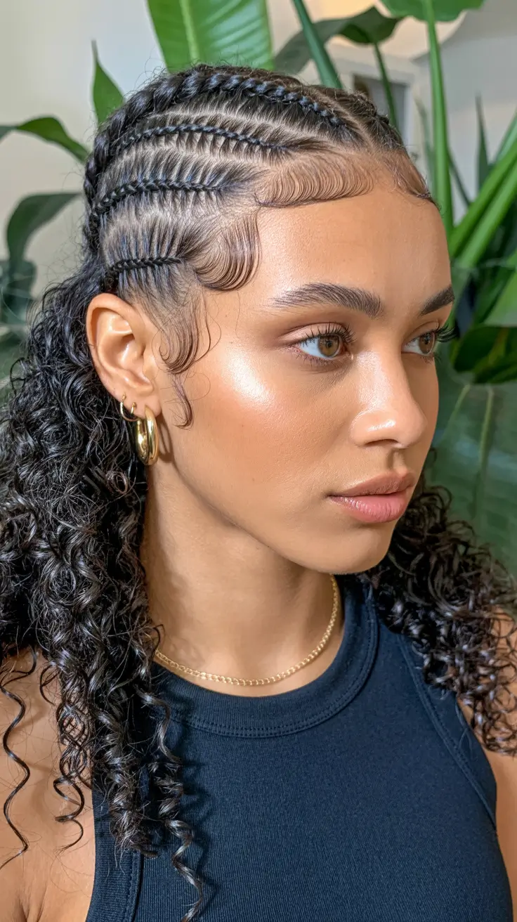There’s something undeniably powerful about precise cornrows sweeping back into defined, glossy curls. This look blends structured braiding at the crown with soft, cascading texture through the lengths. The braids are clean, tight, and symmetrical, creating that almost architectural effect, while the curls fall freely and add contrast. The baby hairs are sculpted with intention – delicate swoops that frame the face without overpowering it. It’s elegant, but not trying too hard. A little Fulani inspiration, a little modern editorial energy.