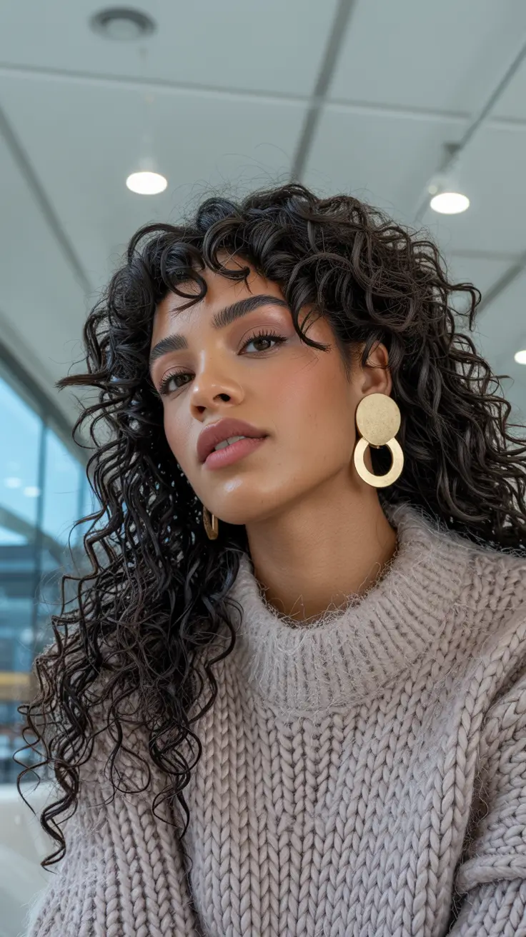 Soft chaos – that’s the first thing that comes to my mind. This layered curly cut brings volume at the crown and controlled movement through the lengths, almost like a modern shag adapted for natural texture. The curls are defined but not stiff, slightly tousled, giving that effortless cool-girl finish that feels incredibly Cute for spring. Paired with a chunky knit and bold gold earrings, it balances cozy and confident beautifully.