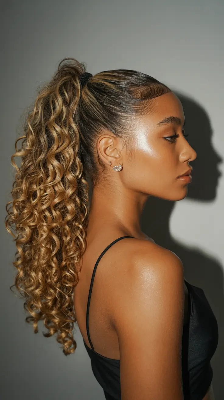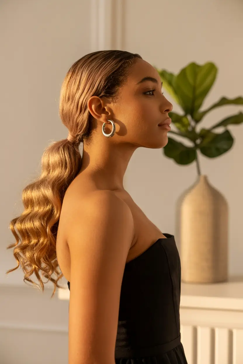 I always recommend a shine-enhancing serum before gathering the ponytail – Color Wow Pop and Lock works beautifully. The curls can be natural or added extensions, depending on how dramatic you want it. It’s one of those Easy transformations that instantly looks polished.