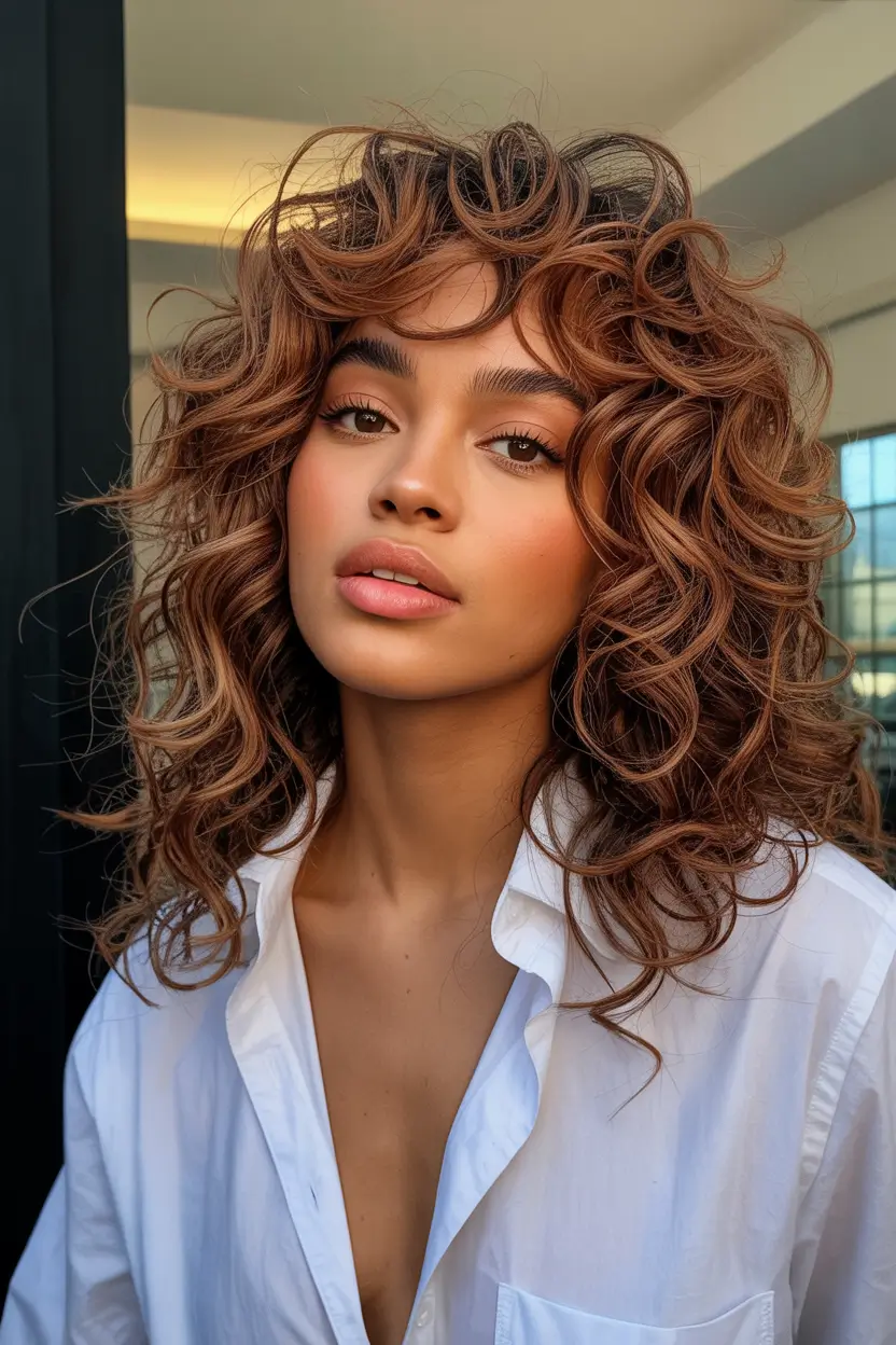 Now this – this is for the girls who want drama without heaviness. Long, layered copper curls with natural movement feel soft, youthful, and slightly rebellious. The length creates flow, but the layering prevents bulk, making it surprisingly Easy to manage. It’s that sweet spot between bohemian and polished – a subtle nod to Boho without going full festival. The warm undertones scream spring renewal.