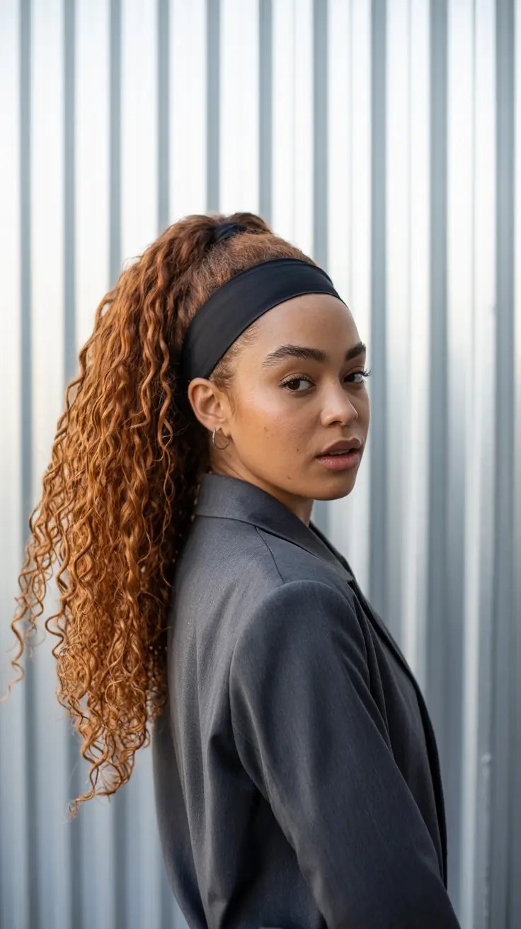 This final look is sleek at the base and textured through the ponytail, secured high and finished with a wide headband. The curls are tight and defined, cascading down with natural bounce. It gives athletic elegance – strong but still feminine.