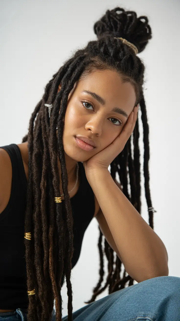 This Half up loc style blends softness with structure in the best way. The locs are long, healthy, and gathered into a high knot while the rest fall freely down the back. A few gold cuffs add subtle shine without overpowering the look. It’s relaxed but intentional – very 2026, very grown.