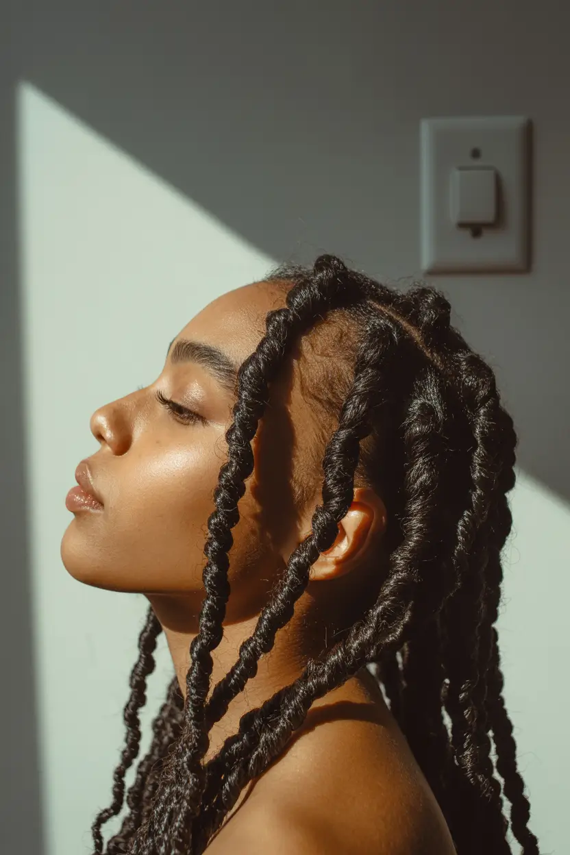 These thick, rope-like Twist sections feel bold and sculptural. They’re evenly parted, glossy, and fall with weight and intention. I love how the twists frame the face while maintaining volume throughout – it’s protective but still striking. There’s something beautifully Simple about this approach, yet it never reads basic.
