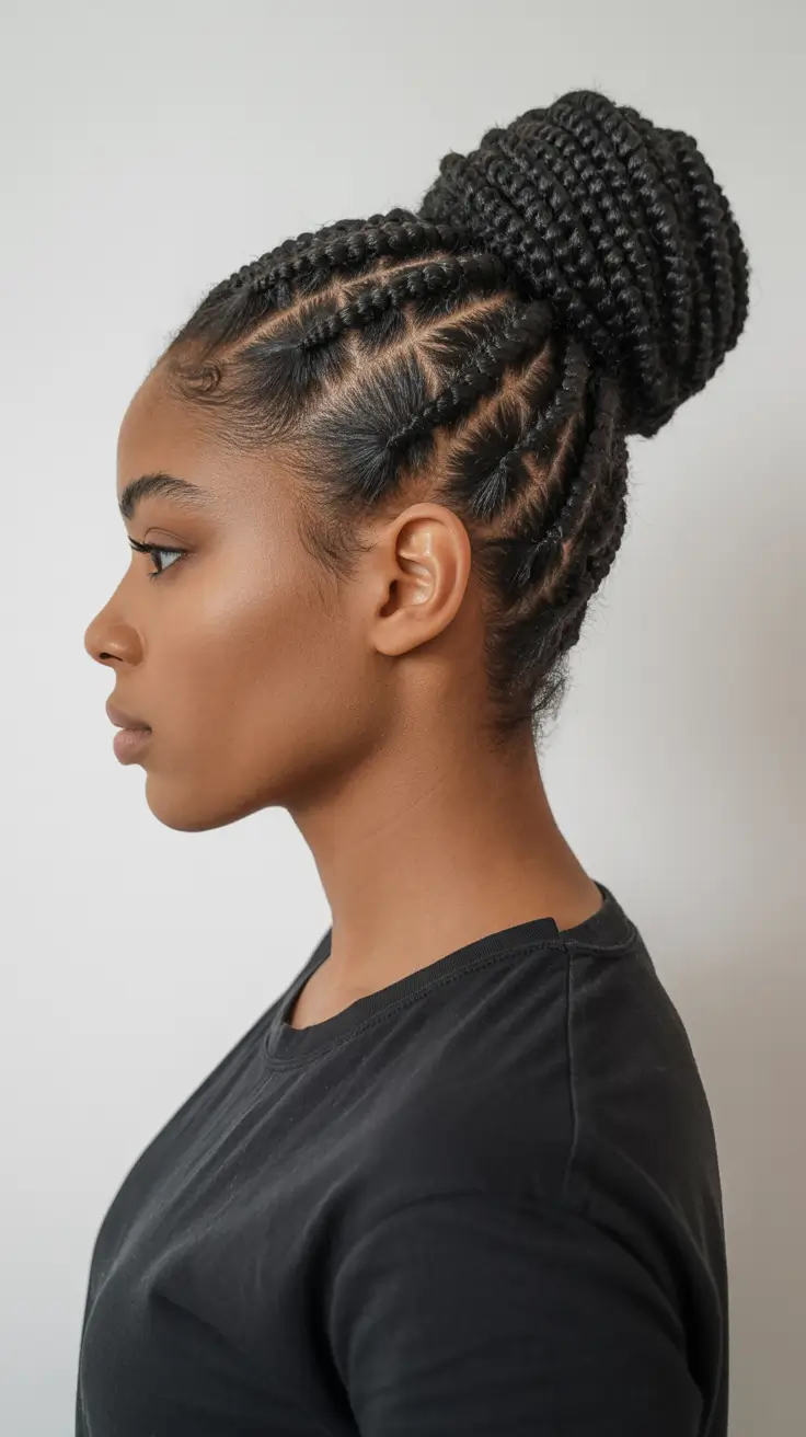 This high braided bun is all about precision. The cornrows are neatly sectioned and feed seamlessly into a voluminous bun at the crown. It gives me modern royalty energy. The braiding technique feels close to Knotless or even small Box variations, keeping tension minimal while maintaining fullness.