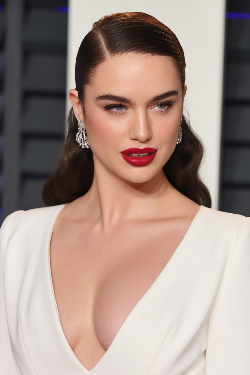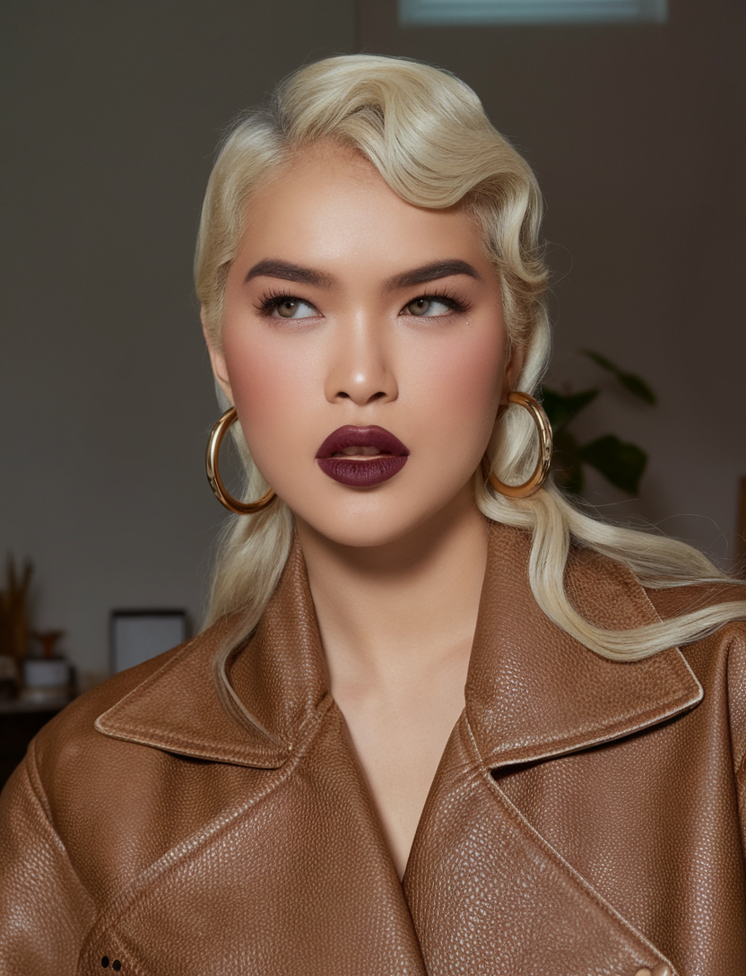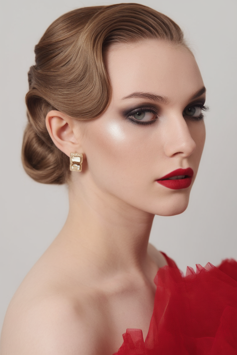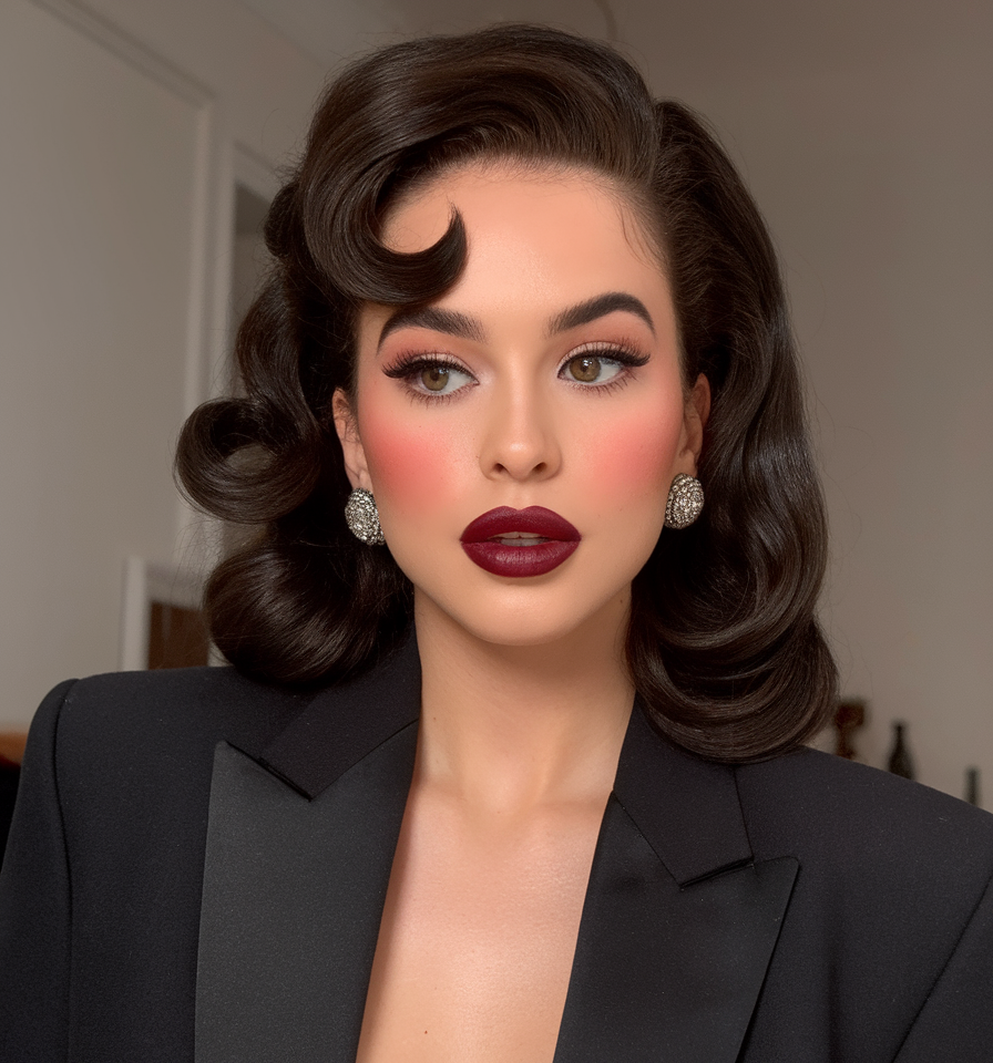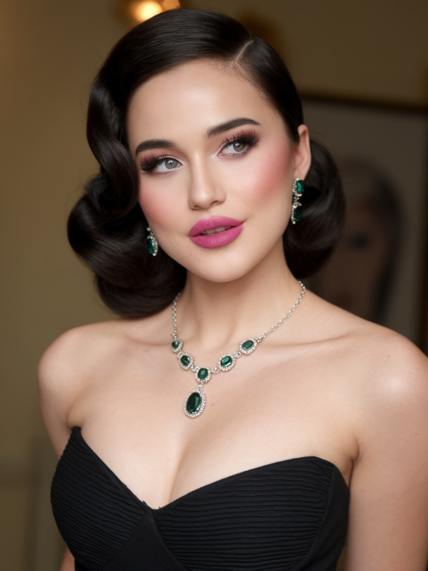 This vintage-inspired hairstyle features dark, glossy hair sculpted into voluminous pin-up curls. The deep side part enhances the structured waves, giving the style a dramatic, expensive looking elegance. The smooth, tucked-in shape adds a clean and polished finish. This classy look is ideal for special occasions, bringing a refined and glamorous touch.