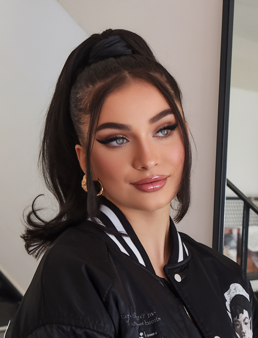 This expensive looking hairstyle features a sleek high ponytail with a voluminous, wavy finish. The dark hair is gathered smoothly at the crown, while face-framing strands create a clean yet effortless effect. The soft curls at the ends add movement and a playful yet polished touch. This style is perfect for a casual yet classy aesthetic.