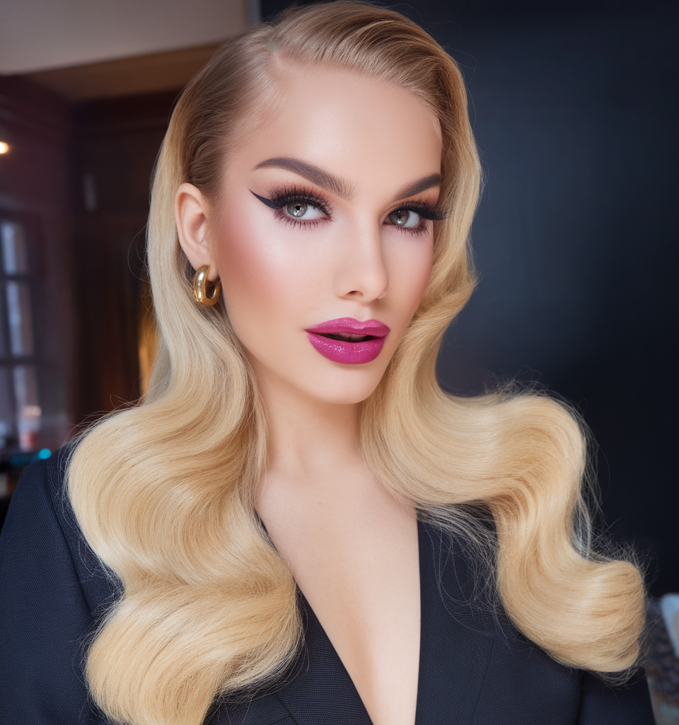 This classy and timeless look showcases long, blonde hair styled into structured, voluminous waves. The deep side part enhances the luxurious feel, making the hair appear full and glamorous. The smooth, polished finish gives it an expensive looking touch, perfect for red carpet moments. This is an ideal choice for those who love elegant, vintage-inspired hairstyles.