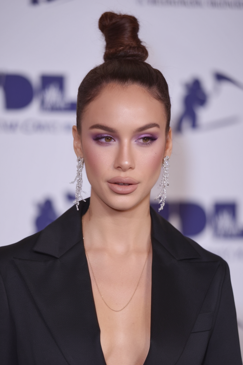 This expensive looking hairstyle features a sleek, high bun with a structured yet effortless appeal. The dark hair is tightly pulled back, emphasizing a clean and polished finish. The twisted knot at the top adds a stylish, modern touch while maintaining a minimalistic aesthetic. Perfect for formal events, this classy updo enhances facial features and creates an elongated silhouette.