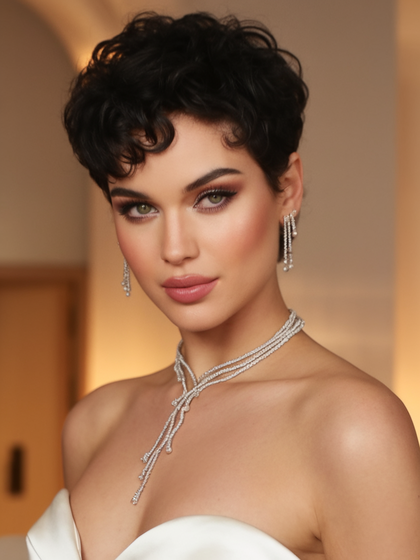 This classy short hairstyle showcases a textured pixie cut with natural, voluminous curls. The dark hair is styled to enhance movement and softness, giving a romantic yet refined look. The short length highlights facial features, while the controlled curls add an expensive looking charm. Ideal for those who love a clean, low-maintenance style with a touch of elegance.