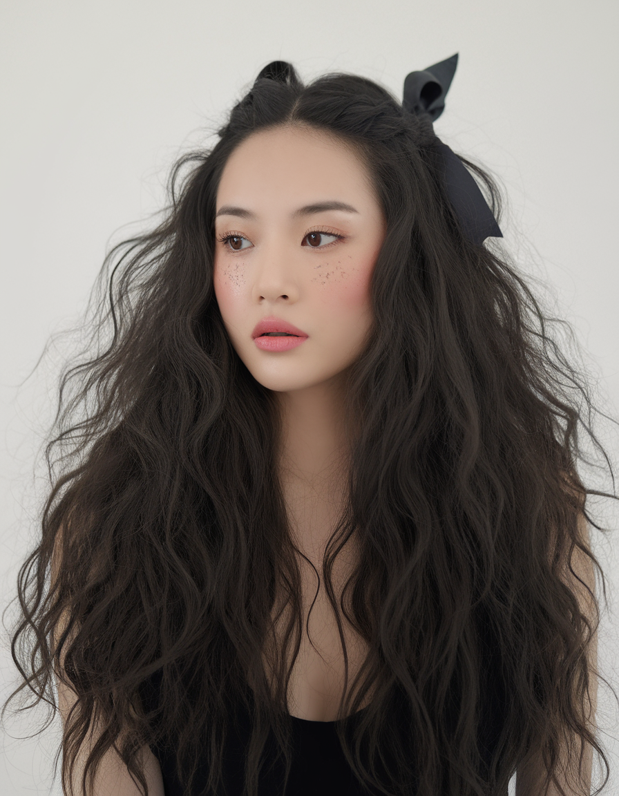 This long, dark hairstyle features soft, natural waves with a dreamy, voluminous finish. The half-up, half-down styling adds dimension, while the delicate ribbon accents create a classy and aesthetic touch. The textured waves give a free-spirited yet expensive looking appearance, perfect for an effortlessly chic vibe. This clean, romantic style is ideal for casual elegance and boho-inspired looks.