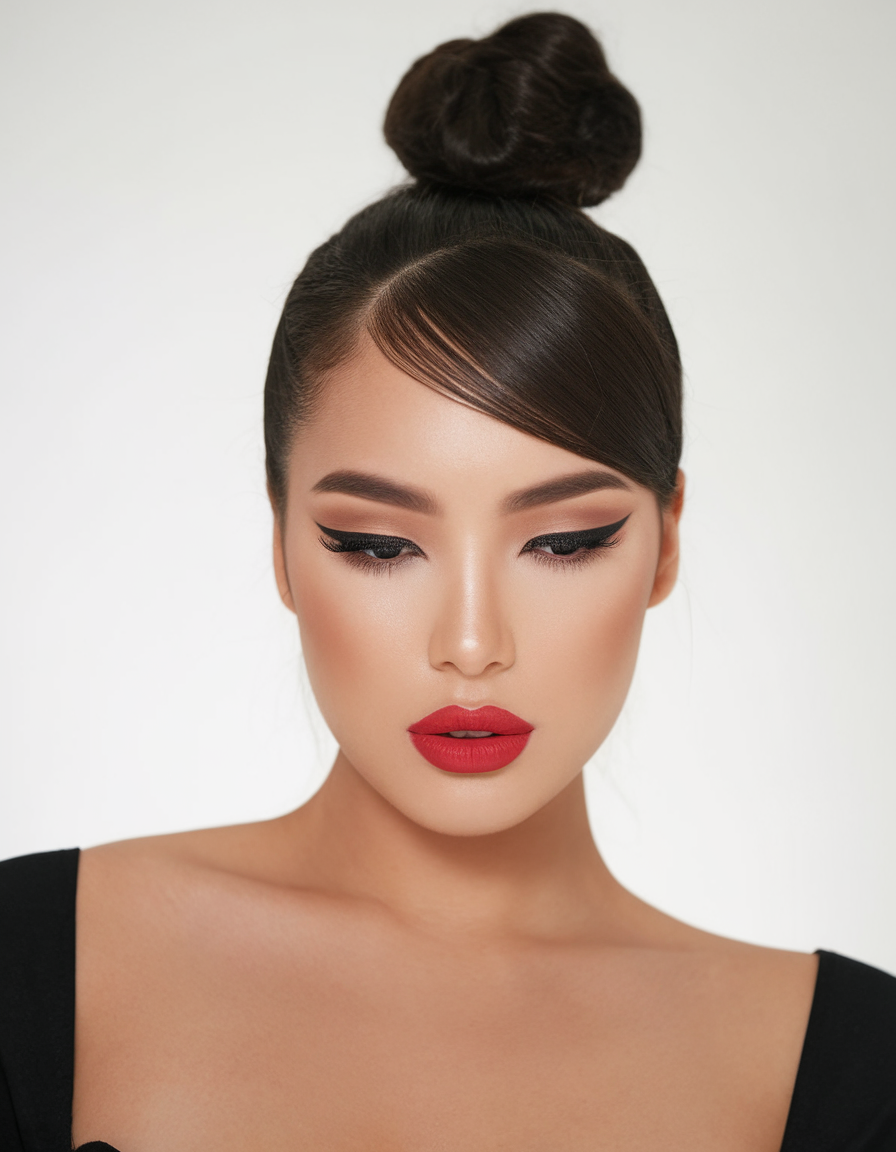This sleek and polished updo showcases a neatly wrapped high bun with a structured shape. The dark hair is perfectly smooth, with a dramatic side-swept bang that adds an air of refinement. The ultra-glossy finish enhances the expensive looking appeal, keeping the style clean and sophisticated. Perfect for formal occasions, this look is both timeless and effortlessly chic.