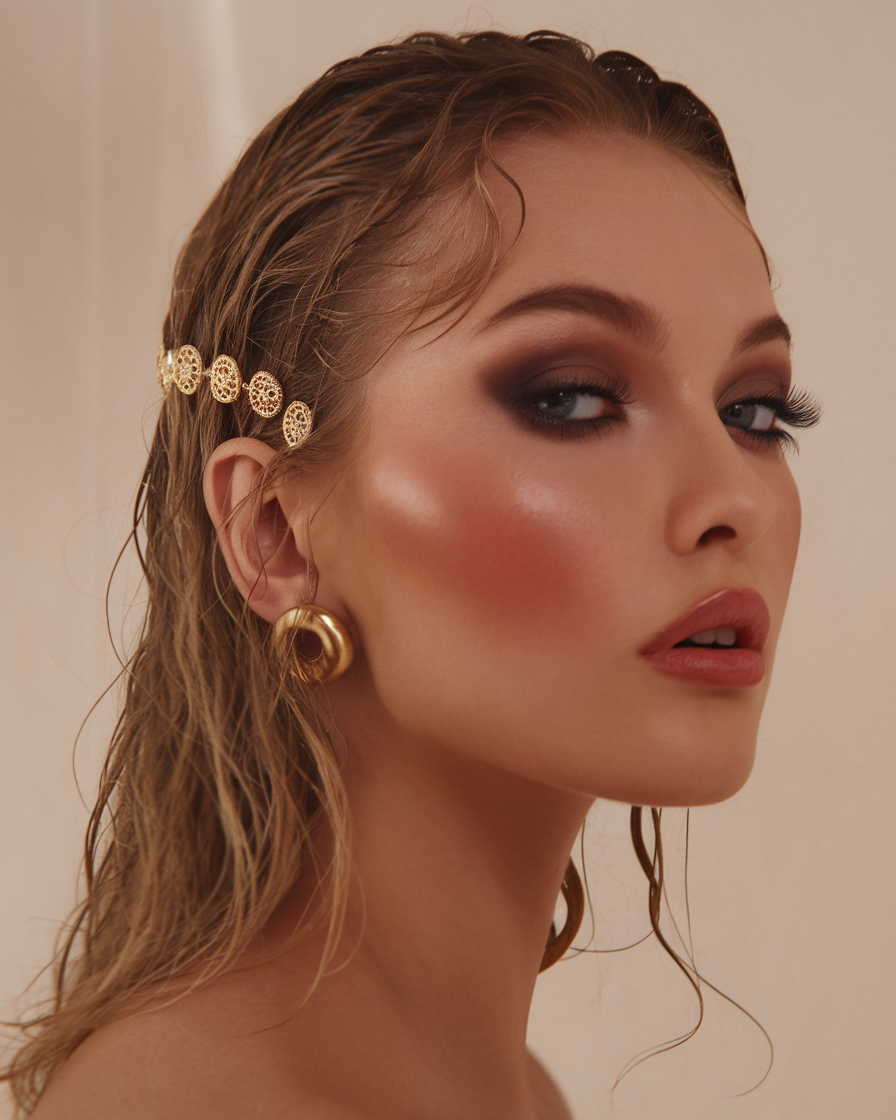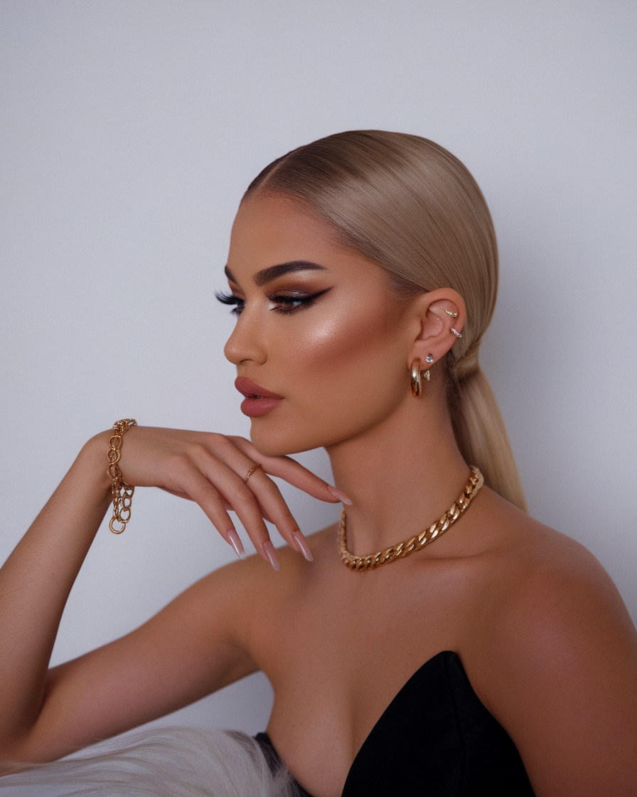 This expensive looking hairstyle features wet-look waves, creating a modern and high-fashion effect. The blonde hair is styled with a sleek, textured finish, adding dimension and movement. Gold decorative clips enhance the elegance, making this a classy and artistic style. Perfect for editorial and evening looks, this hairstyle exudes confidence and bold sophistication.