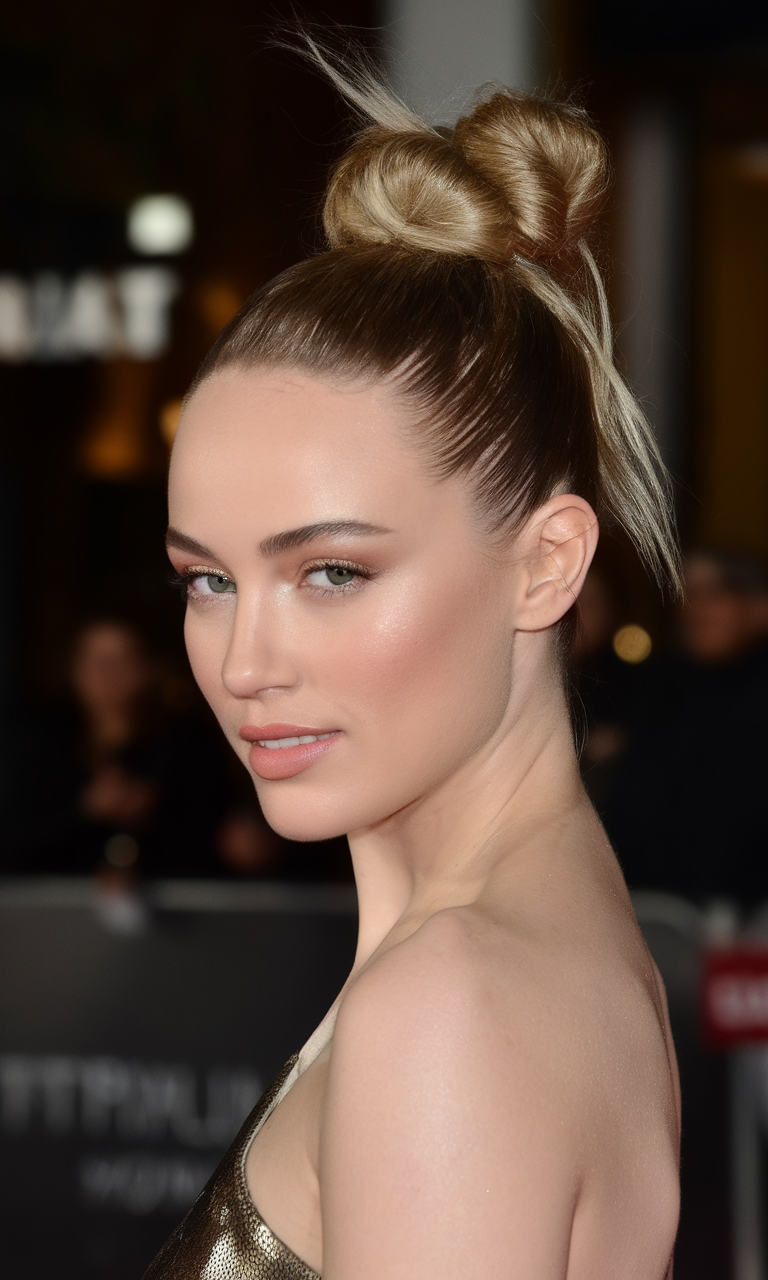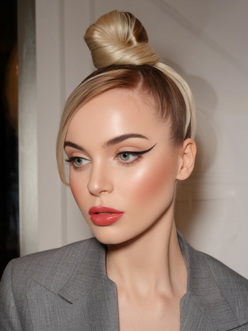 This expensive looking hairstyle features a perfectly clean, structured top knot with a smooth, polished finish. The blonde hair is neatly wrapped into a sleek bun, while soft front strands elegantly frame the face. The contrast between the slicked-back crown and the loose waves adds a touch of modern sophistication. Ideal for both formal and business settings, this classy look exudes effortless refinement.