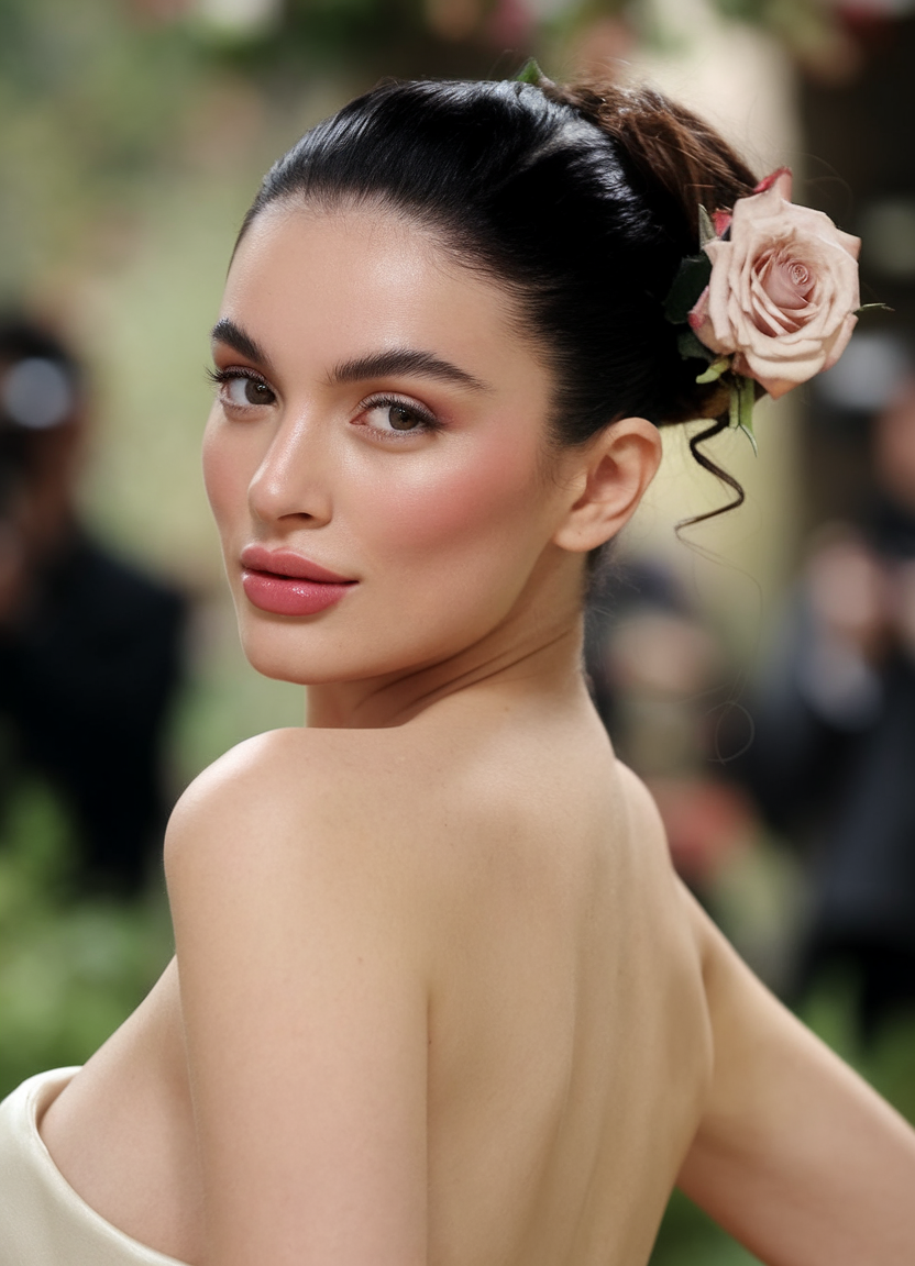 This classy and delicate updo showcases a sleek bun with soft, wavy tendrils framing the face. The dark hair is neatly styled, creating a clean and polished effect. A fresh floral accessory adds a touch of romance, making this an ideal choice for weddings or special occasions. The effortless elegance of this style enhances its expensive looking appeal.