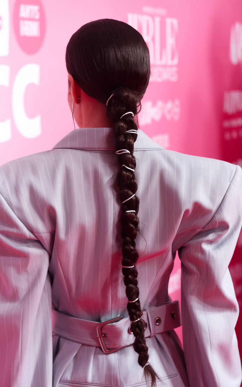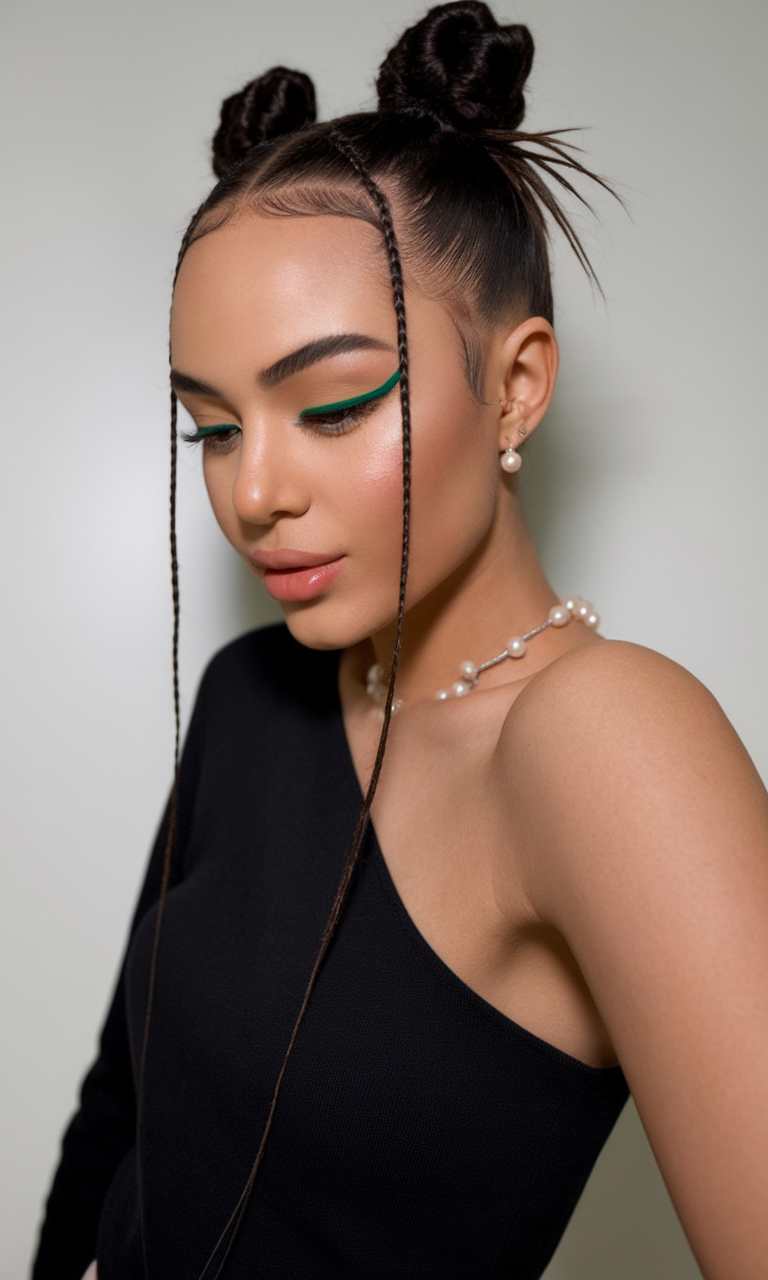 This trendy, expensive looking hairstyle features two structured space buns, adding height and playful sophistication. The clean, sleek front is complemented by two long braided strands that frame the face, bringing a modern edge. The dark hair enhances the boldness of the look, making it an aesthetic choice for those who love statement hairstyles. Perfect for creative events, this style blends youthful energy with a polished finish.