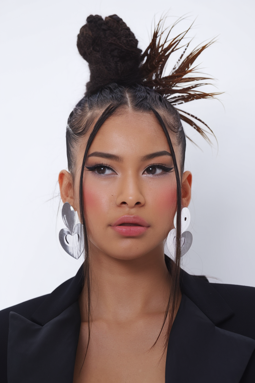 This expensive looking hairstyle features a high braided top knot combined with intricate cornrows for a structured and edgy look. The dark hair is styled with sleek front sections, while loose strands frame the face for a balanced effect. Feather details add a unique, artistic touch, enhancing the overall classy and modern appeal. This bold style is perfect for statement looks.