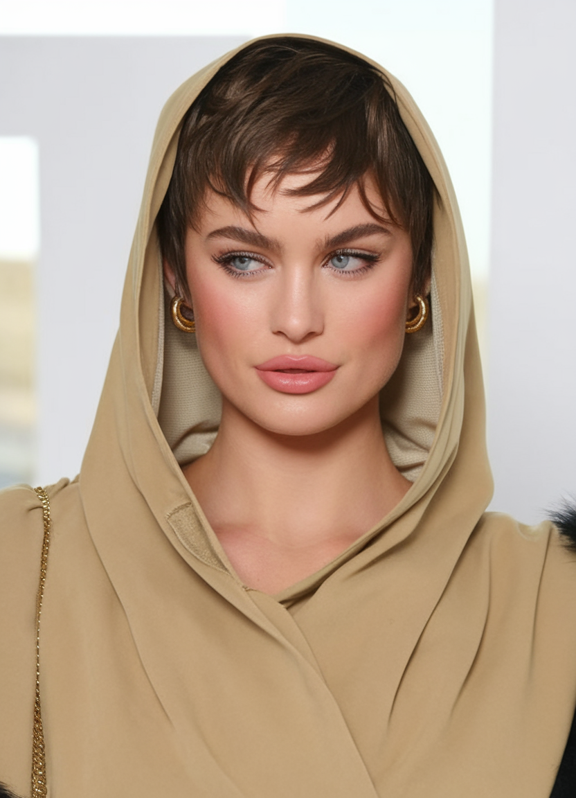 This short, chic hairstyle showcases a textured pixie cut with soft, wispy layers. The brunette hair is styled with a slightly tousled effect, creating movement and volume. The light fringe adds a delicate and clean touch, making this an expensive looking choice for those who love elegant short hair. This low-maintenance yet sophisticated style is ideal for a polished everyday look.