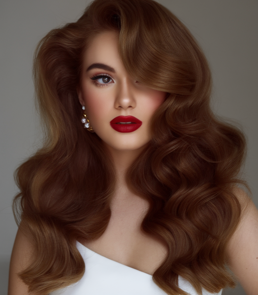 This expensive looking hairstyle features long, voluminous waves styled with a deep side part for a glamorous effect. The rich chestnut color enhances the depth and shine, giving the hair a luxurious finish. The smooth, structured curls add a classy and elegant touch, making this style perfect for red carpet events. This timeless look radiates sophistication and confidence.