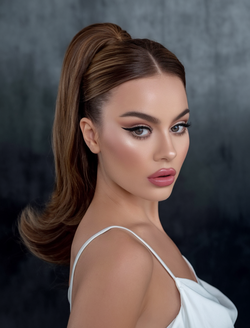 This clean and polished hairstyle features a sleek, high ponytail with flipped-out ends for a retro-inspired twist. The brunette hair is pulled back tightly, ensuring a structured and expensive looking effect. The smooth finish enhances the shine, making this a classy and modern choice. Ideal for both casual and formal settings, this style exudes effortless chic.