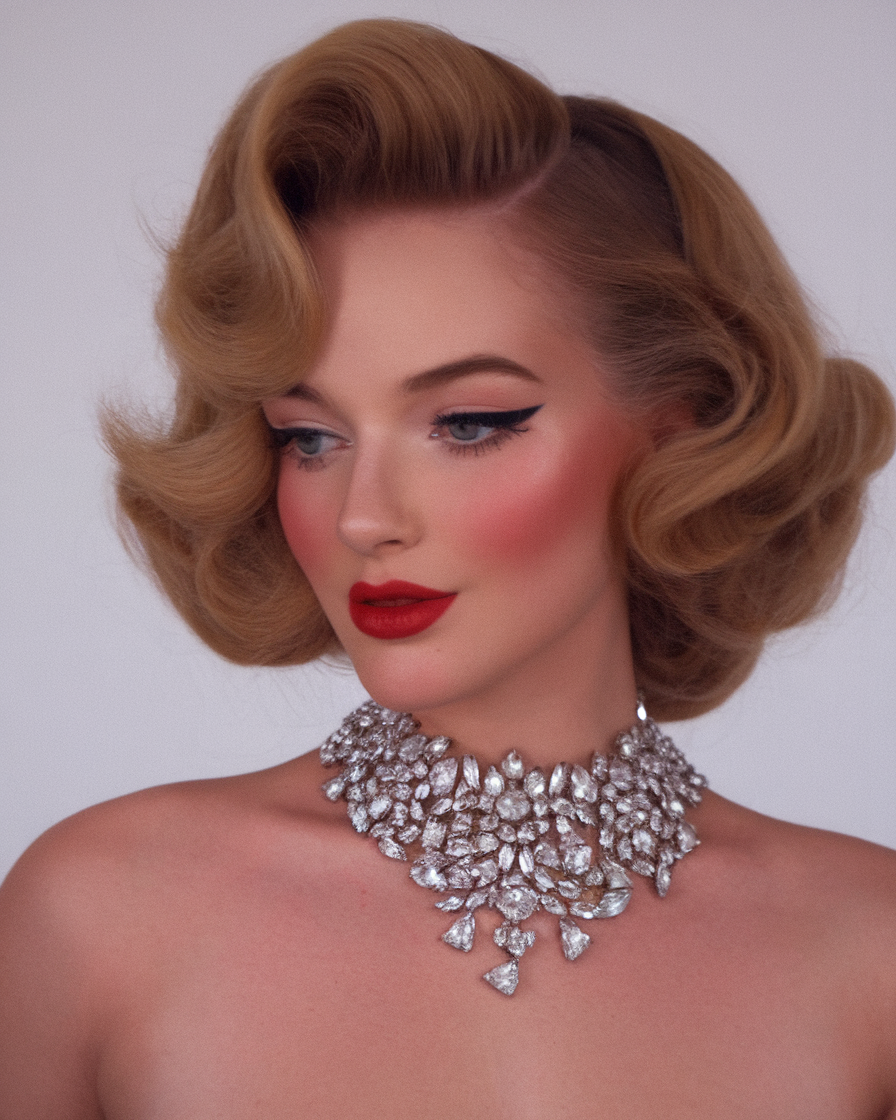 This classy, old-Hollywood inspired hairstyle showcases short, structured waves with a deep side part. The golden blonde hair is styled into sculpted curls, enhancing volume and movement. The polished texture creates an expensive looking effect, perfect for glamorous occasions. This refined style is a statement of timeless elegance.
