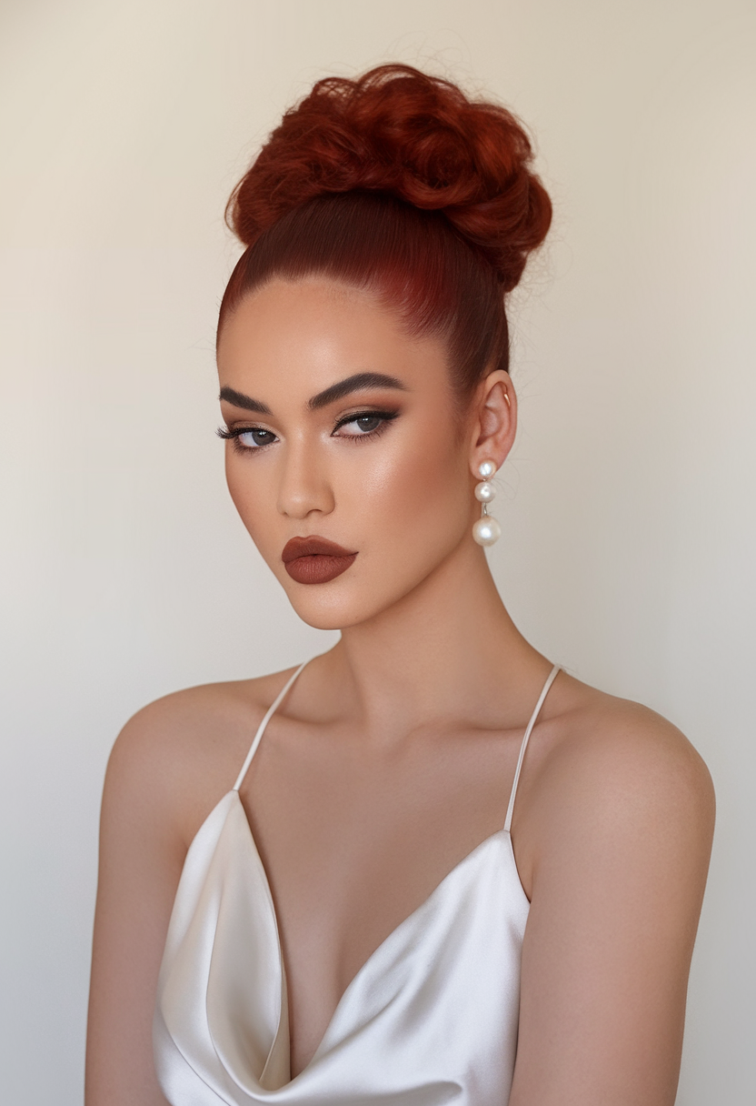 This clean, sculpted high bun is a perfect example of a classy, refined updo. The deep red hair color adds richness and luxury, while the twisted bun creates intricate volume. The slicked-back front keeps the look simple yet striking, emphasizing the sculptural beauty of the bun. Ideal for weddings or upscale gatherings, this expensive looking hairstyle is effortlessly elegant.