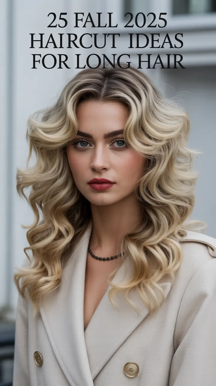 There’s something undeniably magnetic about long, layered champagne blonde hair styled into cascading, Old-Hollywood curls. The fullness at the crown, the smooth, parted sides of the bangs and soft, downdrawn ends imbue the styling with retro-glam appeal–with a contemporary, stylish finishing touch. It’s bold, it’s dimensional, and yes, it’s the kind of Fall long haircut that turns heads on crisp city sidewalks and cozy café corners alike. Whether you’re walking into a boardroom or bundling up in a luxe coat, this style makes your hair the main character.