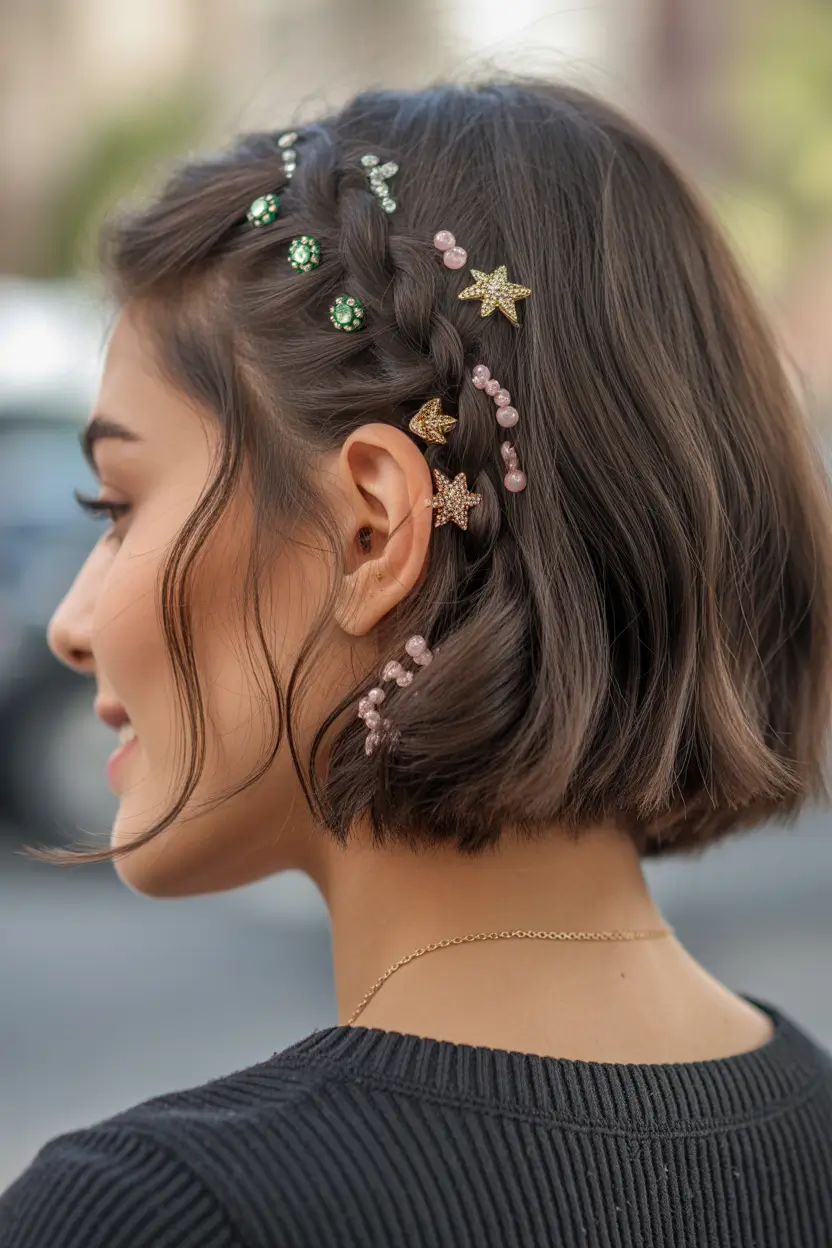 This polished brunette bob takes an everyday chop and glams it all the way up with a braided crown strung with tiny jewels and shimmery pins. The cut stays sleek and to the point, while the sparkling accents flip it straight to after-dark mode. You’ll catch whispers of vintage Hollywood, but the cool braids and metallic decor shout 2025.