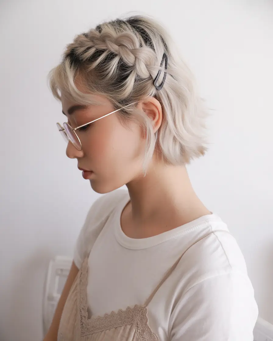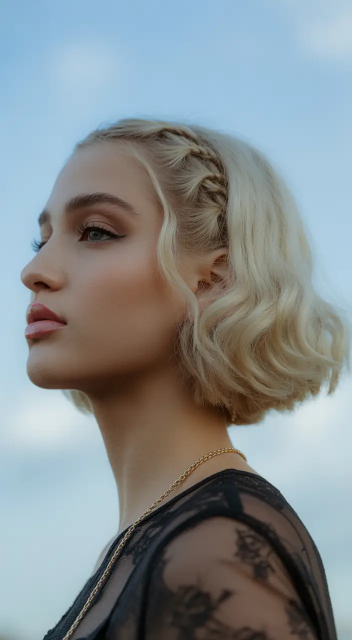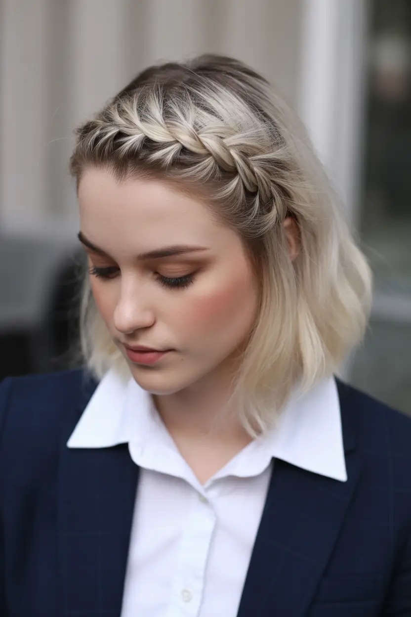 This cheeky bob takes a sleek, concave shape, its edges smoothed to a mirror-like shine. A delicate, braided row runs just above the forehead, holding everything in place. The classic blonde gets a touch of icy dimension, the kind fine hair craves to avoid looking flat. That single braid flips the vibe, keeping the look ultra-refined but also relaxed enough to grab coffee right after a presentation.