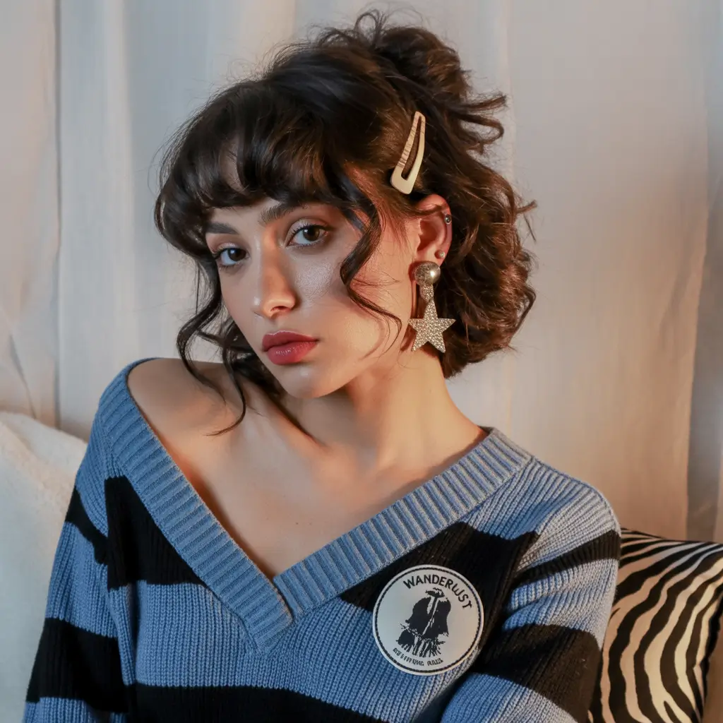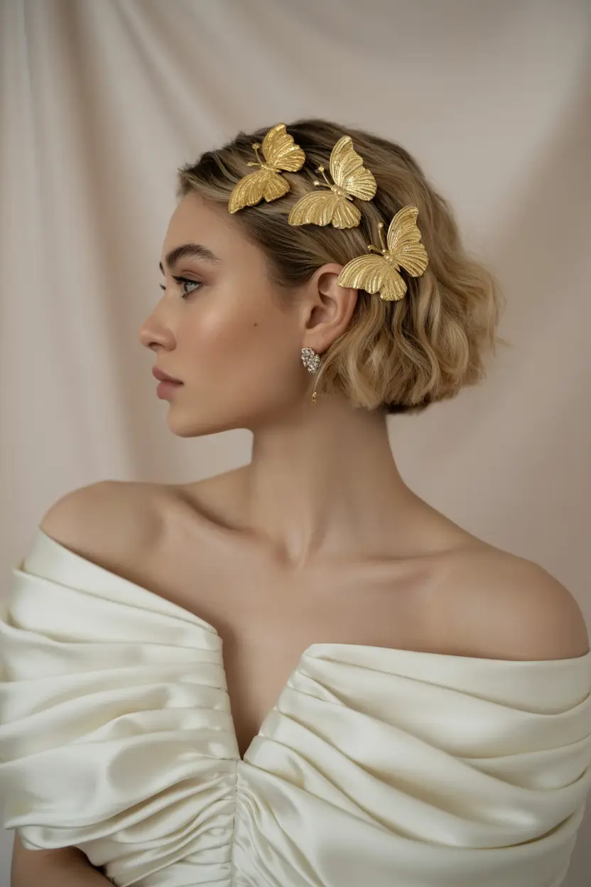 This haircut has a dreamy, vintage feel that’s hard to resist: soft wavy bob kissed with jeweled butterfly clips that turn everyday hair into royal art. The cut and shade are fresh, though—a thatch of blonde that spins through autumn light, grazing the collarbone to frame the neck. The texture sits between loose, carefree waves and the cool polish of a shag, giving fine hair the volume illusion without having to fuss. Ideal for anyone who’s styling-challenged but wants that effortlessly “I woke up like this” look that’s worked through the afternoon.