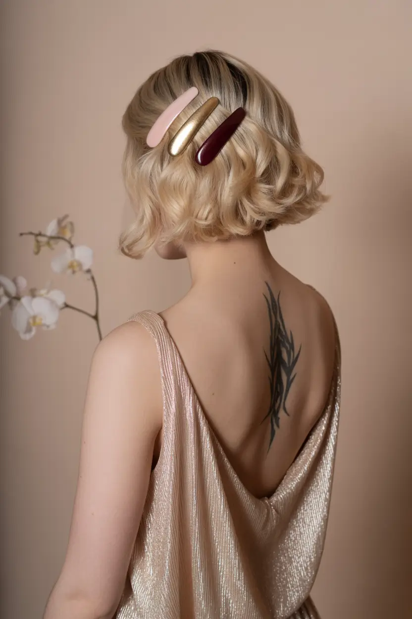 Picture a short bob that delivers instant chic: loose curls that barely graze the collar, and oversized clips that wink in divine blush, shiny gold, and rich burgundy. The bars of butter-blonde are warm—a soft shade that plays beautifully with the spices, cayennes, and forest greens lining the season’s clothing racks. It’s proof that the same haircut can tell a totally different story with just an accessory hit.