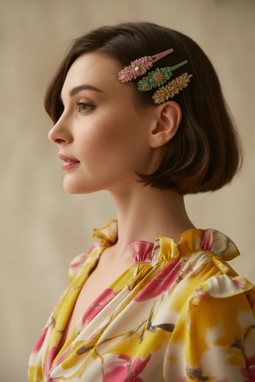 To me, this hairstyle is the ultimate in low-fuss glamour. WFH days, school drop-off, or a coffee run at noon—throw in a clip, and you look {ready for} any unplanned brunch shot. Accessories announced their grand comeback the millisecond this bob landed: a single jeweled or tortoiseshell clip can flirt with glam. Proof that a few seconds spent pinning can make your look feel entirely fresh with no scissors in sight.