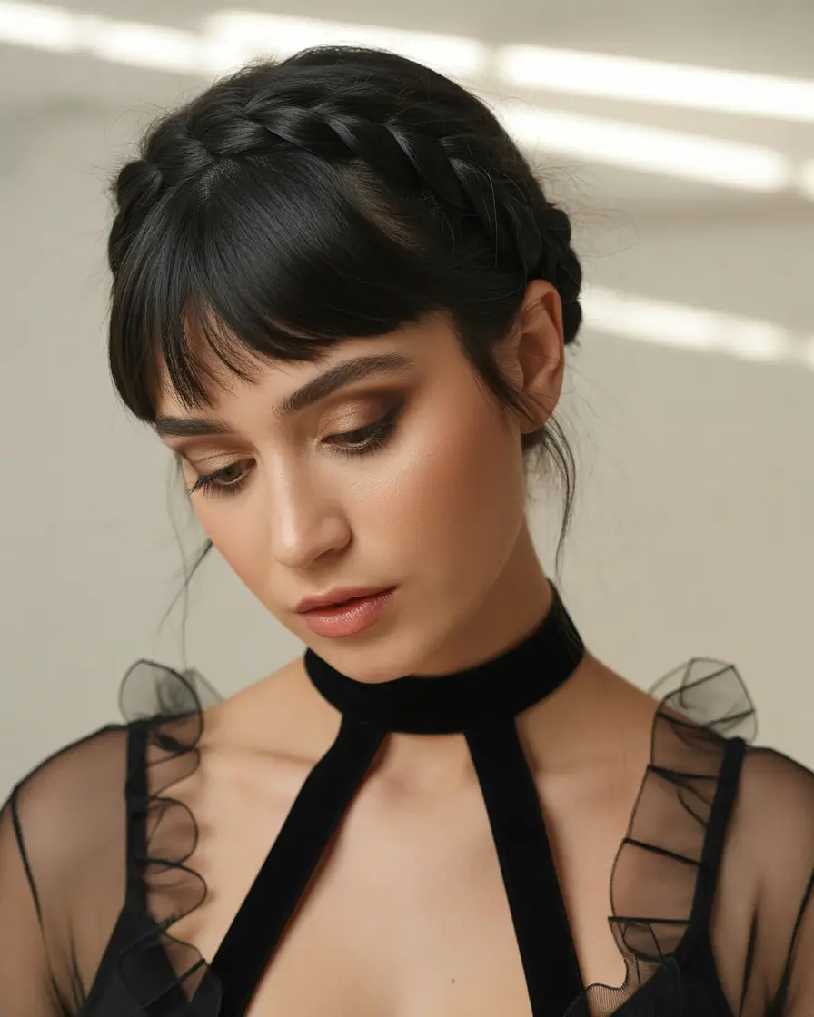 The next upgrade is where things get enchanted. Imagine a short bob that’s crowned with a vine of braids, perfectly planted like a tiara of plaited drama. A swoop of soft bangs drapes over the forehead, giving romanced focus to the eyes. It’s a hybrid of strength and softness that works with wider, oval, and heart face shapes. Deep, glossy onyx hair feels especially pertinent when the rest of our wardrobes lean into jewel tones and plush textures. It’s a glossy mirror of the same moody color scheme that’s lurking on all the racks in the shop window.