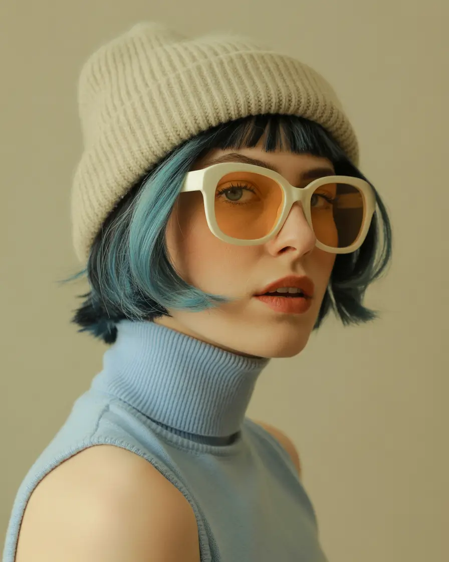 Okay, let’s crank it to bold. This angled bob, brushed ice-blue with short sharp bangs, could walk off a Seoul runway on its way to the front row. The fringe cuts just above the brow, nodding to the chic, slightly angular pieces that shout street style. Winter oversized yet glossy frames, and a relaxed knit beanie that says “mess with this? never.” aunt-OMG this style. If you’re ready to stop traffic when you’re on foot, this chrome cobalt bob might be exactly the head-turn the box-cutter trending.