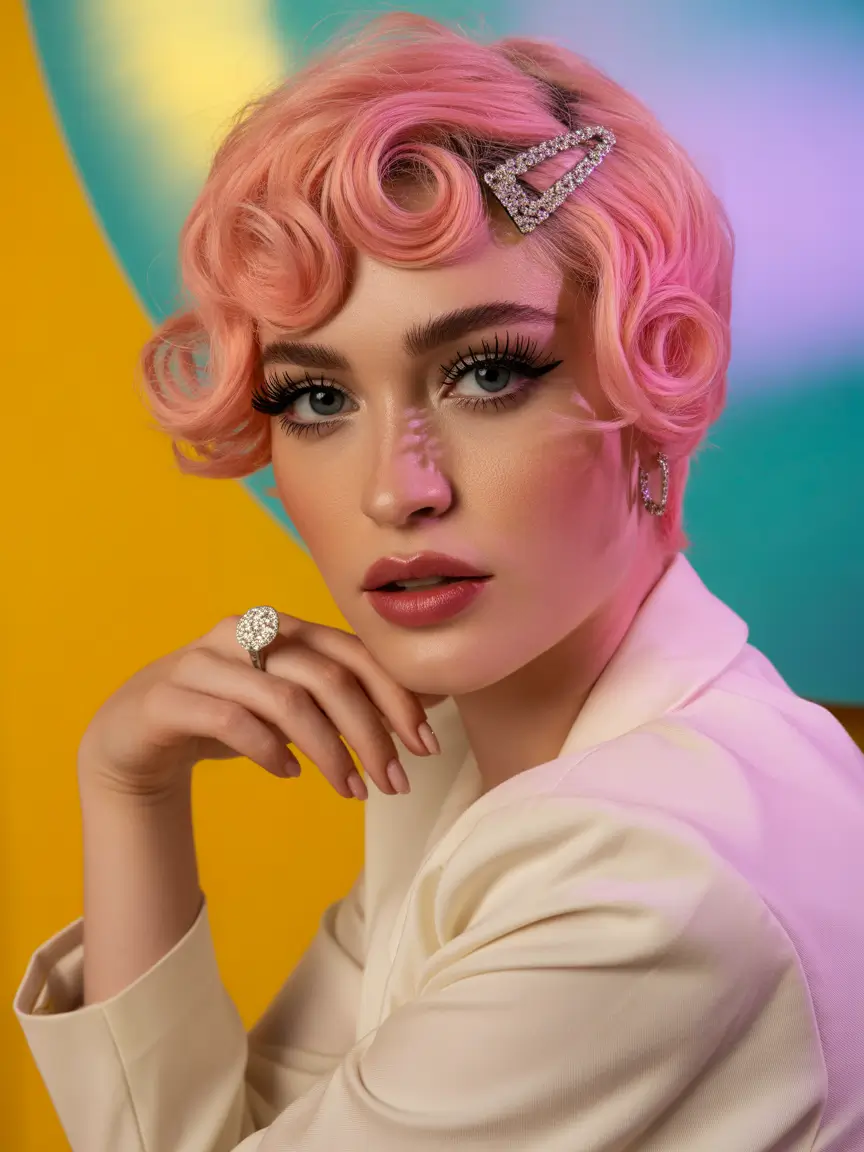 Talk about a show-stopper! This sleek spring bob rocks a lively pink color and gorgeous vintage curls, all topped off with tiny rhinestone clips. The hot pink swoop right to the cheekbones creates a dramatic silhouette that frames the face perfectly. If you live for glamour and are ready to go all in, this is your moment to pump vintage style into the future sister.