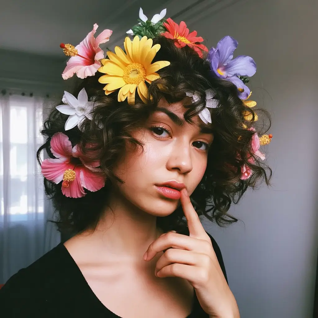 This style flips the regular curly bob into art by tucking in huge, colorful flowers that spill over the sides like a bouquet in bloom. Starting with a soft brunette base, this cut is practically begging for an accessory. The natural curls already dance with light, and the layered bob lets it work for thick or fine hair. With the flowers as the finishing touch, the whole style feels like a crown that updates itself every week.