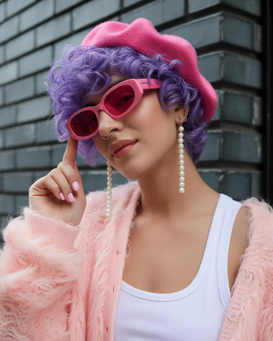 Now for the hairstyle that demands a cherry-on-top accessory: this lavender-dripped bob, worked into a curly crown, slips on a matching beret and earns a salute. The shape is a shaggy, cropped bob that cherishes volume, so it’s a match made in heaven for anyone with a tight curl. The way the color dances between lilac, periwinkle, and stormy purple feels art-school-worthy, the beret whispers “Hey, I’m still together” in the sweetest way. If the last look flirted with vintage, this one takes it on a scooter ride and straight into TikTok.