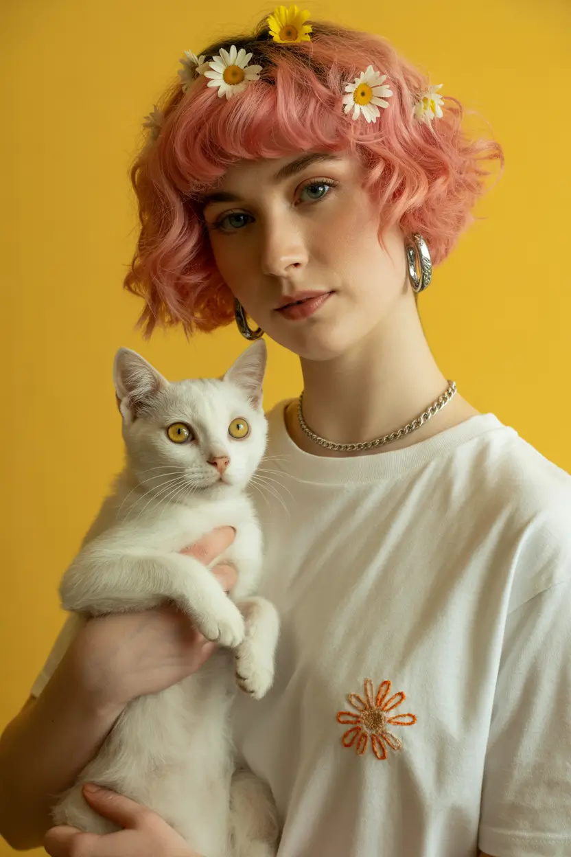 This take on the bob marries shining brunette with a crisp, straight perimeter that hovers just below the jaw, then a burst of oversized florals that make it dance. The straight shape emphasizes bone structure, while the blooms introduce a breath of whimsy. Absolutely gorgeous for fine hair that craves body without the drama of a layered chop—the code is to use contrast. A disciplined base, spun into a relaxed braid of clips, moves anywhere the schedule directs, morning to midnight.