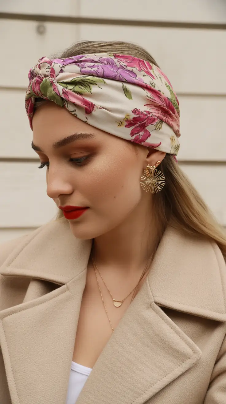 I see floral headwraps for 2025 as a groovy classic given a wake-up call. They still carry that boho spirit, but pairing one with a structured coat and a bold lip gives it a sharp twist. The smooth headphone of the scarf plays off the polish of the hair, creating a cool visual rhythm that I can’t get enough of.