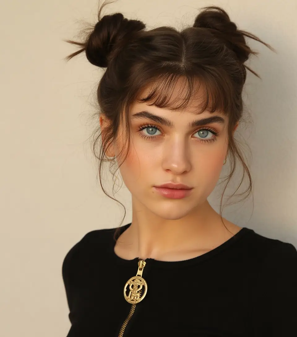Nothing radiates good vibes quite like messy double buns and a touch of fringe. This look feels like a happy mix of fun and class—ideal for days when you want your fall short hairstyle for 2025 to look playfully young but still put-together. The fringe softly hugs your cheeks, and the buns keep the whole vibe light and airy.