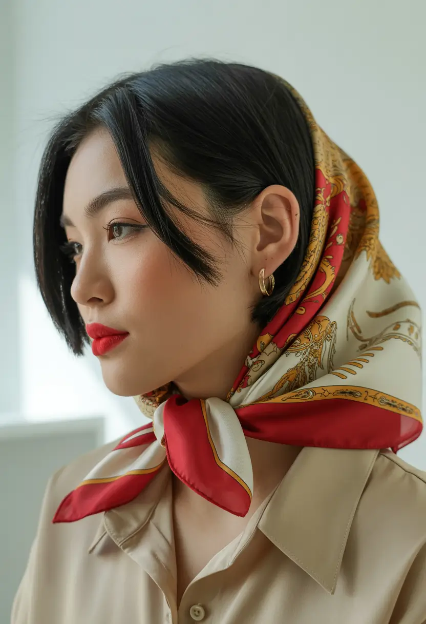 A floral scarf turns the most basic short haircut into a head-turner. Slip it over straight or tousled waves, and the pop of color sets off the whole look while keeping flyaways on lockdown. This Fall vibe is 2025-ready—chic but still totally functional for the chilly season.
