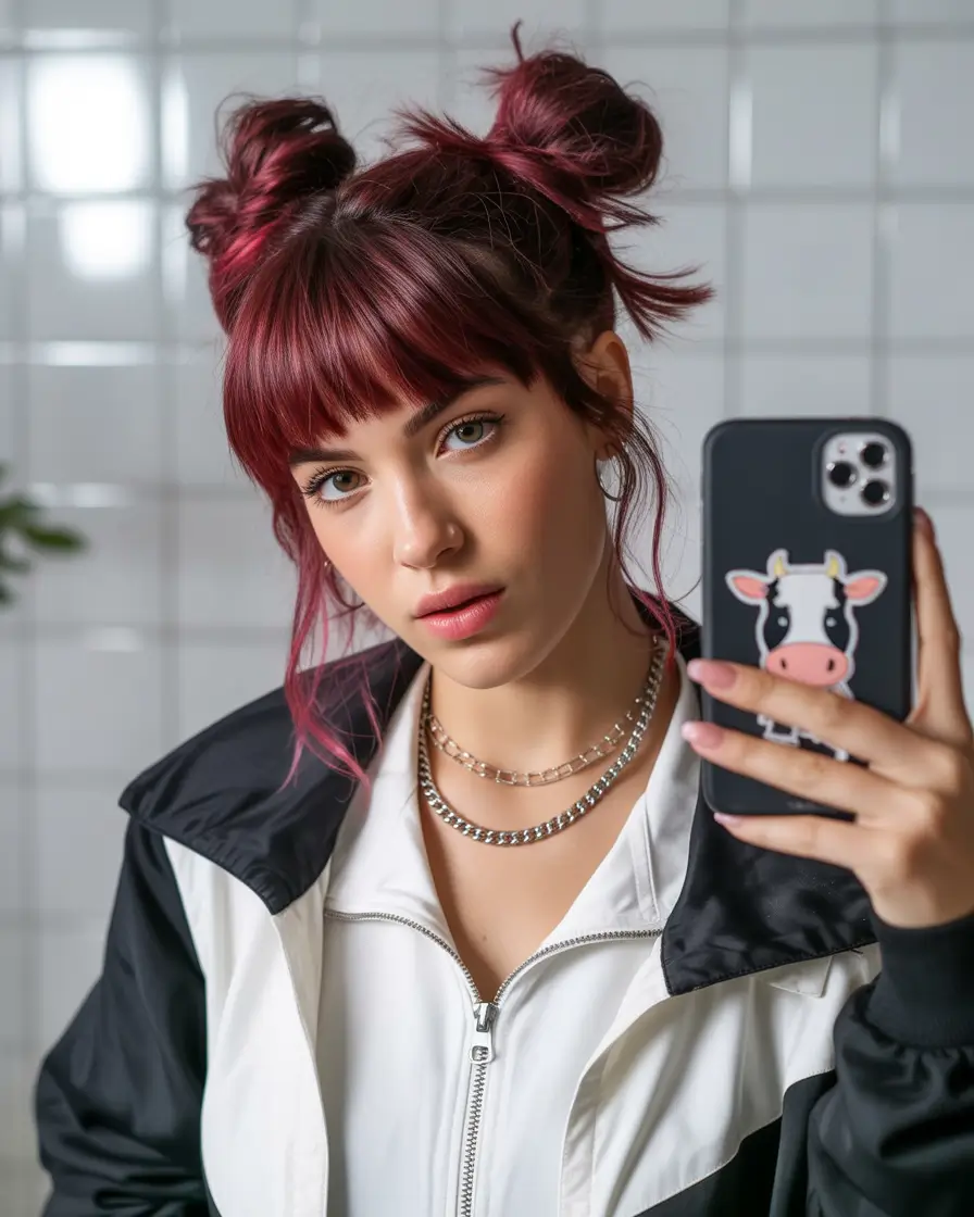 If you want a style that’s both edgy and totally feminine, grab those tiny buns and bangin’ fringe. They’re like the mini sidekick that lifts the whole hero story. The buns perch up high for that carefree, playful vibe, and the blunt fringe tames the wildness right when it tries to wander too far. Totally 90s and 2000s, and 2025 is begging for it on those short, autumny locks.